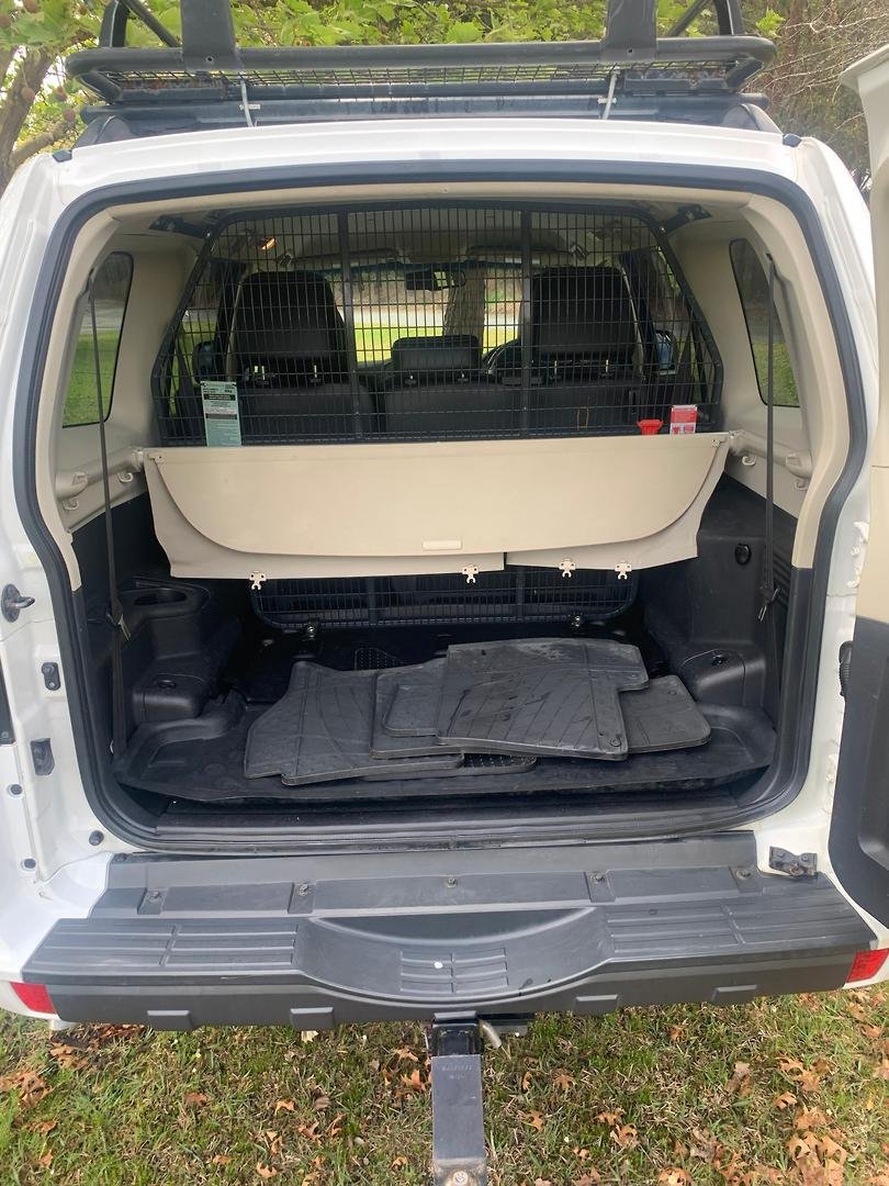 Roof racks with roof basket, cargo barrier and towbar.